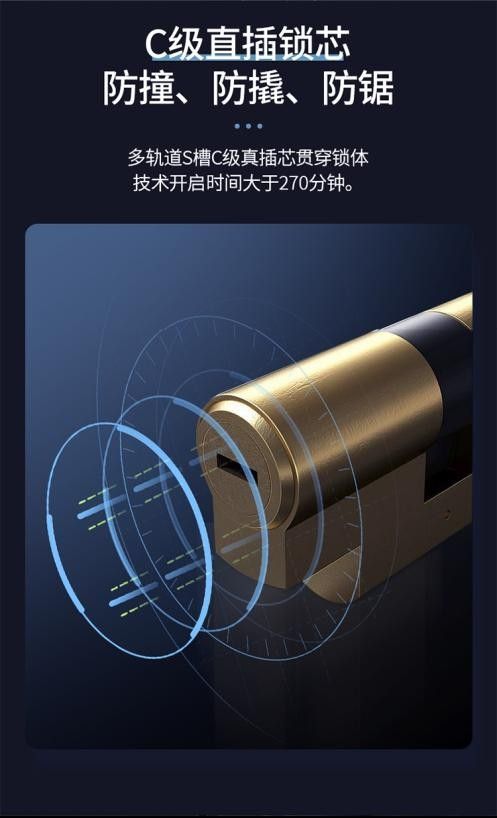 为保障智能锁的安全性,德铠曼智能锁采用的便是升级了曲线槽的C级锁芯,安全等级更高。理论上,即使是专业开锁人员,至少也需要270分钟才能打开。而如果用强扭工具开启锁芯,锁芯内部破坏,自爆锁死,导致无法开启,防盗性能加倍。