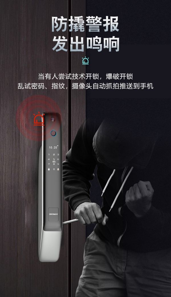 很多用户最担心的是,家中无人时不法分子通过技术开启、或是撬锁入室盗窃,所以智能锁有无智能报警系统便十分重要。