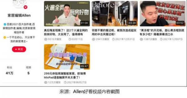 从那个时候起,Allen与百度结缘,开始了他的家居达人之路,并渐渐地步入正轨。如今Allen发布的内容,主要是聚焦分享装修干货,推荐的产品比较的实用,且好看又精致,比较符合现代人选购家居产品的趋势。