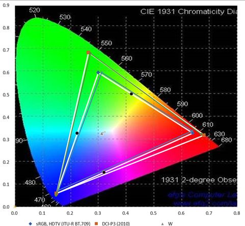如下图,左图为经D65标准色温下的专业色彩调校,经光学测试得到的实际色域图十分接近标准色域图,各项模式下的白点值十分接近D65色温下的白点值;右图为某三色激光电视,一般三色激光电视采用的是BT2020色域,但它的实际色域只介于DCI-P3和BT.2020色域之间,并没有与BT2020标准色域图吻合。而且播放BT.2020色域影片表现不出来,播放DCI-P3色域影片色彩(尤其是绿色和红色)溢出又非常明显,白点值与D65色温下的标准白点值偏差较远,导致画面色彩会比较奇怪。