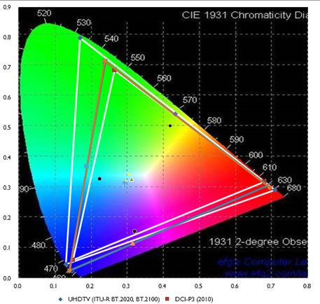 目前我们所观看的电视节目与电影大片,在后期制作过程中主要基于三种色域标准,包括高清阶段的BT.709标准,4K超高清阶段的DCI-P3与BT.2020标准。其中DCI-P3是美国电影工业为数字电影院所制定的色彩空间标准,拥有更广阔的红色、绿色系色彩范围,视觉冲击力强,能更好满足人类视觉的体验,同时大多专业电影院放映设备也是符合这个标准。