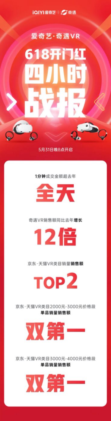5月31日晚8点,618电商盛典火爆开启。作为时下最in的科技产品,VR一体机受到广大消费者的疯抢。以国产VR头部品牌奇遇VR为例,昨晚618开门红仅1分钟,其成交金额就轻松超过去年同期的全天销量。截止当晚24点,奇遇VR销量较去年同比增长12倍!与此同时,还斩获京东、天猫VR类目销量及销售额第二,以及双平台2000-3000元及3000-4000元价格段的单品销量&销售额的双料冠军。