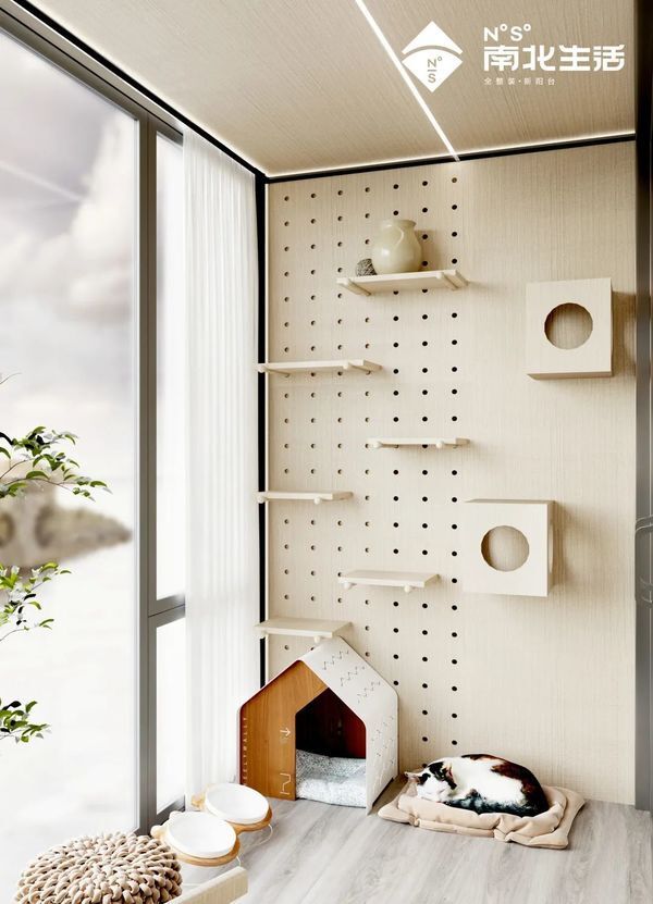 宠物的世界很简单,在阳台摆一个小窝,放一块柔软的垫子,这就是它最爱的地方。洞洞板文可摆放饰品装饰阳台,武可供猫咪蹦跳攀爬。顶与墙统一的色彩又让本就充满萌意的阳台更显时尚的气质。