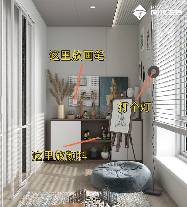 画画需要的条件真的很简单,一个三脚架,一个落地灯,在阳台柜里放满颜料,在洞洞板上插满画笔,一方安静的阳台,一个闲趣的下午,画笔在纸上唰唰的落下,艺术在阳台静静的诞生。