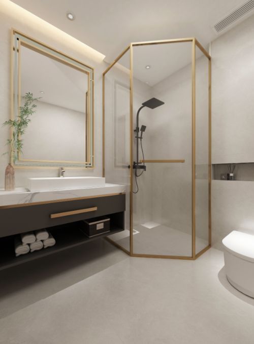 【卡门灰】墙地一体化的应用,色彩淡雅纯粹,搭配简约风的浴室柜,烘托出一种舒适、恬静的氛围感,营造出生活的高级感,让人们卸下一天的疲惫,得到充分放松。