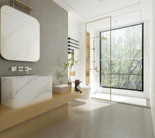 应用产品:A+FTH10290180S芬迪灰-地面、FZZ00360120GL云海白-墙面