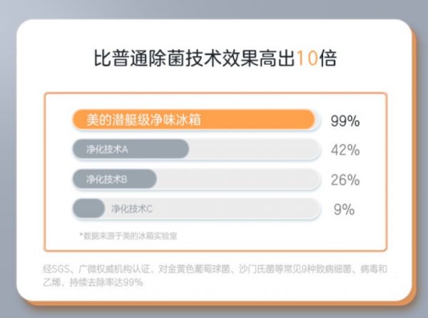 作为冰箱行业健康保鲜新赛道的开拓者和领跑者,美的冰箱自2019年首发净味系列冰箱以来,持续创新先行科技,在行业内引发净味除菌的健康风暴,引领净化科技和体验升级;2022年,美的冰箱推出了全新一代PST+智能净化科技,在硬件模块和软件系统上再度提升,能量更强,维度更全,效果更好,实现了19分钟急速净味,99%除味除菌除病毒除乙烯,真正做到食材的净化处理,不仅除味除菌,还能健康保鲜。硬核的健康净化实力,发布后第一时间就获得国内知名第三方实验室、权威检测机构广东省微生物分析检测中心的的认证,业内领先的净化水准,得到检测方的高度认可。