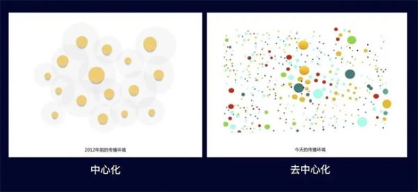 我以一个老品牌人的身份来看中国的整个传播生态的变化,事实上我觉得在今天我们以2012年秋天来做一个分水岭比较合理。这是我2016年画的一张图,2012年前,智能手机尚未广泛运用、微信还未崛起的时候,企业的传播生态是中心化的。而之后,随着短信、各种app、微信、直播、抖音等各类媒体的综合,每天行业内都有成百上千的内容呈现,呈现出去中心化的星河状。
