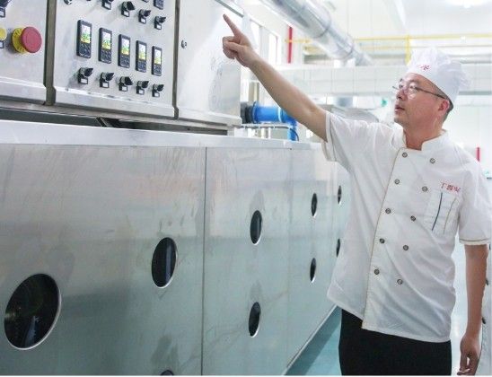 丁学观善于思考,勤于动手,不放过任何可以革新和改进的地方。2004 年,与厂家合作研发了第一台专门适用于苍南温州(桥墩)月饼的压饼机器。正式从手工压饼晋升到机器压饼,大大地减少了技师的劳动强度。2009 年,在贵州坐车通过隧道时,丁学观突然萌生了研发隧道炉应用于月饼烘烤的想法。有了构思以后,他立马与生产厂家联系,全程参与烘烤隧道炉的研发。