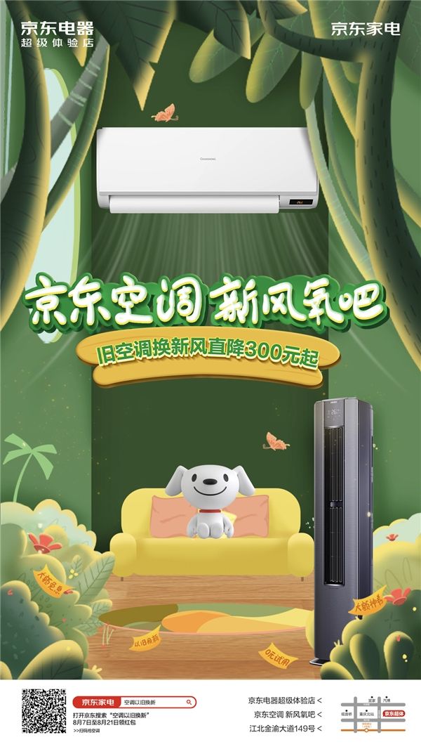 不止有老空调的征集评选活动,京东电器超级体验店多项活动诚意满满。买空调以旧换新直降300元起,献给重庆人的“高温补贴”。消费者可以在8月9日至15日到重庆超体店外广场新风氧吧参与活动,或在京东app搜索“空调以旧换新”参与。