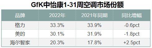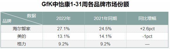 在空调市场,格力份额为33.3%,同比下滑0.6个百分点;美的为30.1%,同比下滑1.8个百分点;海尔智家为20.3%,同比净增2.5个百分点。