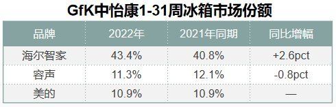 在冰箱市场,海尔智家份额为43.4%,同比净增2.6个百分点;容声为11.3%,同比下滑0.8个百分点;美的为10.9%,同比持平。