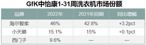 在洗衣机市场,海尔智家份额为46%,同比净增3.2个百分点;小天鹅为15.1%,同比净增0.1个百分点;西门子为9.6%。