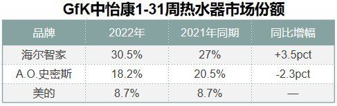 在热水器市场,海尔智家为30.5%,同比净增3.5个百分点;A.O.史密斯为18.2%,同比下滑2.3个百分点;美的为8.7%,同比持平。