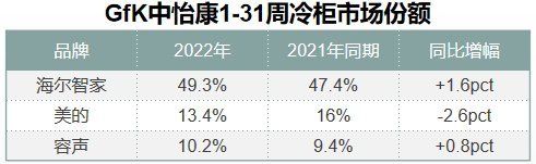 在冷柜市场,海尔智家为49.3%,同比净增1.6个百分点;美的为13.4%,同比下滑2.6个百分点;容声为9.4%,同比净增0.8个百分点。