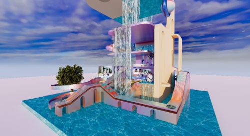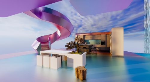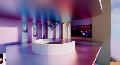 进入CMH内部空间,临水别墅映入眼帘。别墅外部是曲折迂回的多层外围廊桥,内部是充满未来生活气息的居室。敞开式的夸张的圆拱阵列结合超长的悬浮廊道桥,达成建筑的有序统一感。幻彩钢搭配灰淡黄色承重墙,斑斓的霓虹灯与流水瀑布形成视觉张力,映射到整个建筑,力求实现梦幻般的环境体验。别墅的设计融合了建筑解构手法,以高饱和度的幻彩表达超现实主义。这套样板间表达Z世代对家的态度,无拘无束,充满想象力。希望大家放飞想象,自由畅想未来家庭空间。