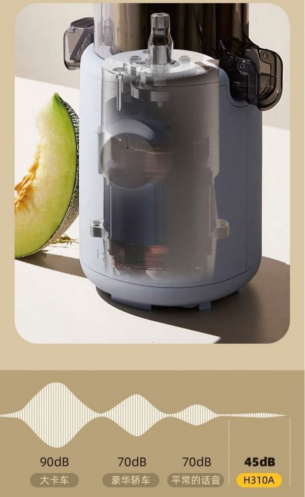 作为惠人原汁机产品中最轻巧的一款, H310A机身重量只有3.4KG,纤巧轻便、简洁精致,女孩子也可以单手握持。有着高科技内芯的H310A使用起来却非常方便,机身只有一个旋钮三个功能:榨汁、反转、停止,一键操作简单直观,电器盲也可轻松使用。H310A采用的是低噪音电机,在使用时只产生平均45分贝的声音,比平常70分贝的说话声还要轻,完全不用担心惊扰到家人和邻居。
