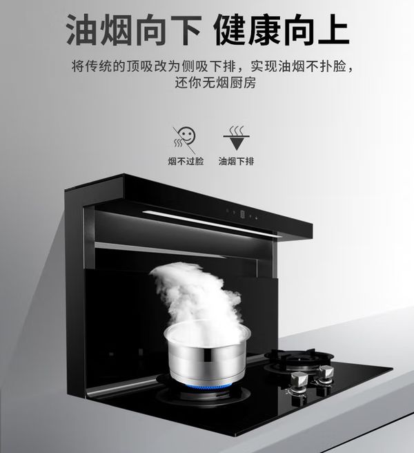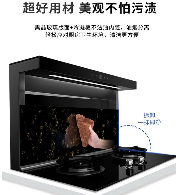 省心:无油烟已经大大降低了厨房的清洁难度,再加上还有着黑晶玻璃面板、特氟龙材质油网、智能操控等技术和优秀材质加持,在清洁上更加省心。