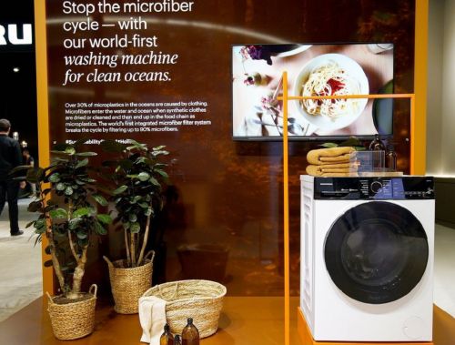 除了过滤洗涤循环中释放的90%的合成纤维外,滤芯由98%的再生塑料制成,每台机器中的聚对苯二甲酸乙二醇酯(PET)桶使用60多个再生塑料瓶制造而成。