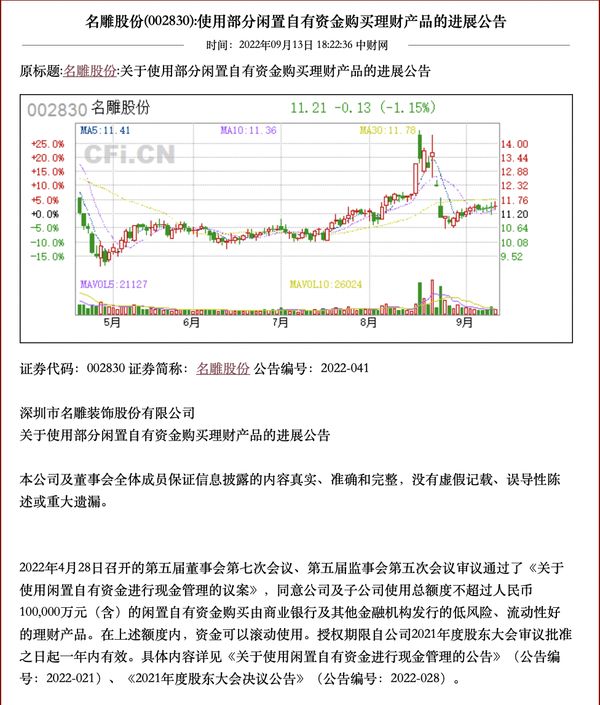 家装快讯|名雕股份公布近期使用1.35亿元闲置自有资金购买理财产品