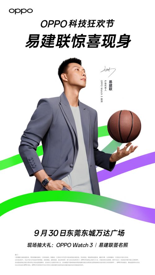 9月30日19:30,易建联将现身东莞东城万达广场OPPO体验店,分享OPPO Watch 3使用感受,和用户一同体验运动记录、健康检测、独立通讯等功能,并随机抽取1名现场用户送出OPPO Watch 3手表1台。活动现场还将展出OPPO X 2021卷轴屏概念机、OPPO Air Glass 智能眼镜等多款未来科技产品,供用户体验。