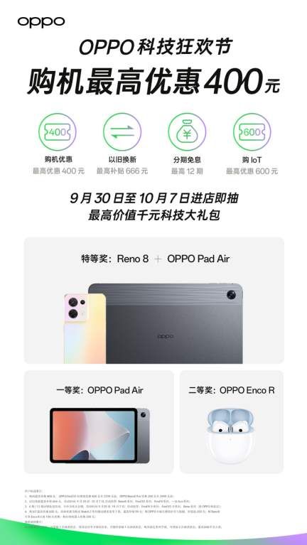 活动期间,消费者到店购机还可享多重优惠福利。OPPO Find X5系列、Reno8系列等多款产品限时优惠,最高立减400元。除立减福利之外,用户购机最高可享12期分期免息,以旧换新最高可享666元购机补贴,购买OPPO Watch 3系列、OPPO Pad、OPPO Pad Air还有精美礼品赠送。