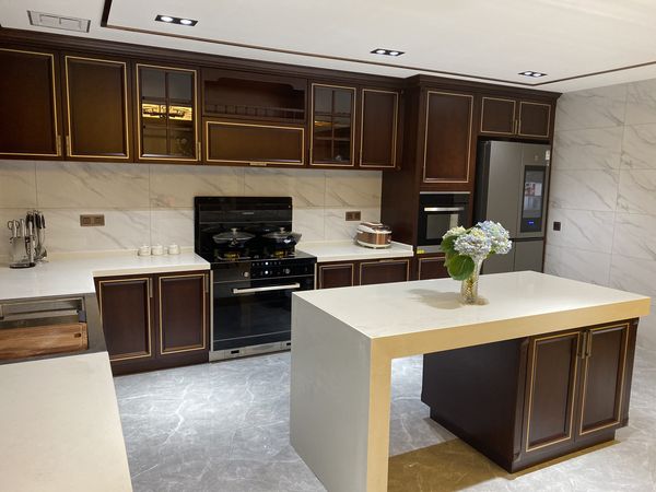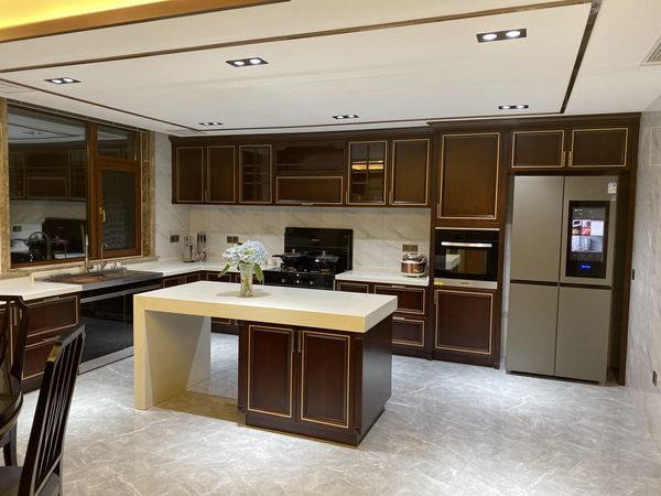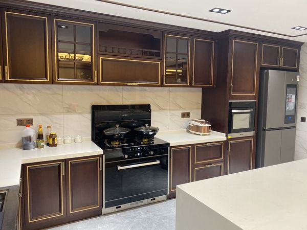 厨房,采用美大鼎厨的北美原木风,暖色系的温暖,配合搭配一台美大集成灶风华蒸烤一体,整体色彩为黑色+高级灰系,搭配金属香槟金色的线条冲撞,使得整个空间,简约大风,同时简单耐用。
