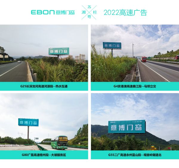 2022年8月7日,意博门窗再次抢占品牌宣传高地,高炮广告强势进驻各省份,分别占领江苏、广东、广西、湖南等省份,逐步铺开全国各地高速交通枢纽的高炮宣传,品牌影响力势如破竹。