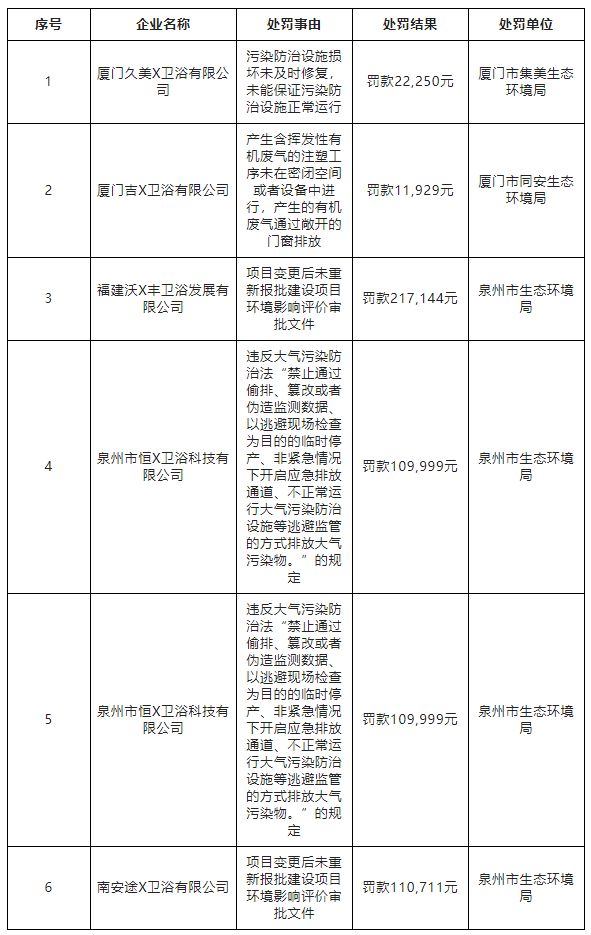 据福建多地生态环境部门通报,7-9月共有6家卫浴企业因环境违法被行政处罚并通报,其中泉州4家、厦门2家。在被行政处罚的企业中,一家因项目变更后未重新报批建设项目环境影响评价审批文件,被罚款217144元。