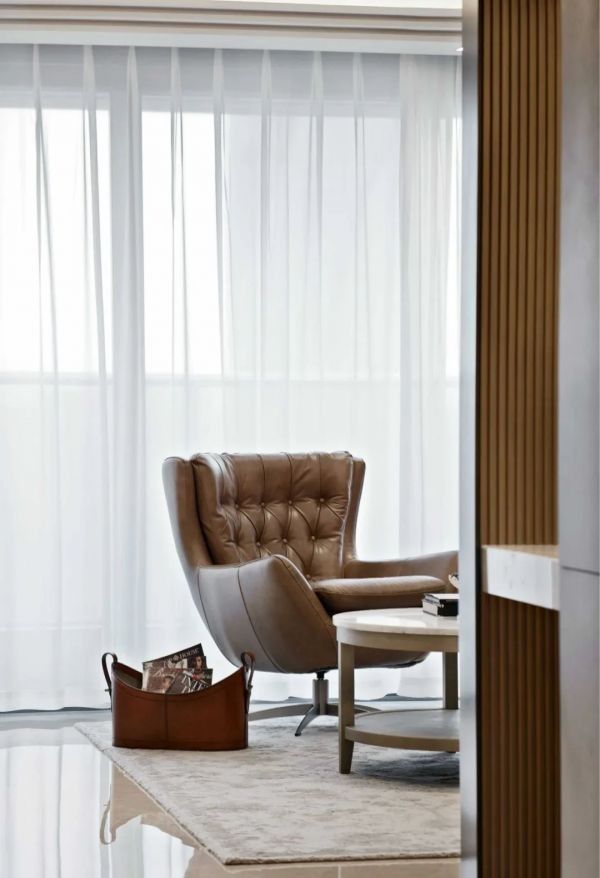 白色半透幕帘让空间四周透入充足而柔和的自然光线,绵延至家中各个角落。在客厅远端搭配一把Oxford休闲转椅,构筑窗边的休闲角落。
