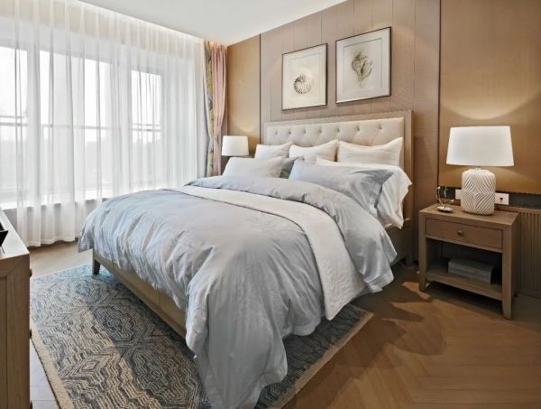 卧室搭配的十分舒适、干净,功能尽可能地被简化,家是一个私密的、自在的地方,应当更在乎个人生活的便利性和舒适度。