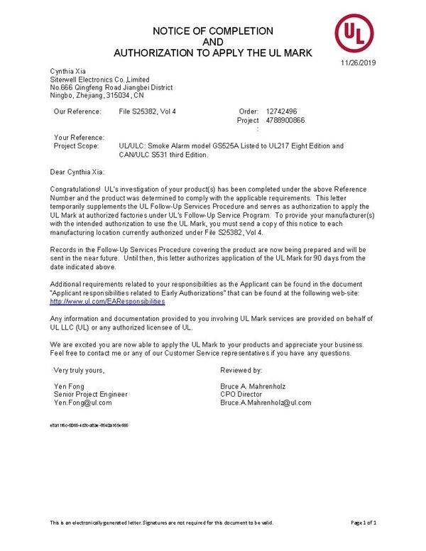 2021年,赛特威尔将GS525A烟雾探测报警器送至美国进行UL217-8标准测试,在我们技术顾问Isaac Papier(先后曾担任霍尼韦尔安防产品战略发展的副总裁,美国UL负责安全系统委员会的主席等,长期任美国国家安全产业协会标准化委员)带领下,面对UL首席审核官DAVE Mills的重重考验,排除万难、精益求精,于今年9月1日才正式拿到UL217-8标准认证书。