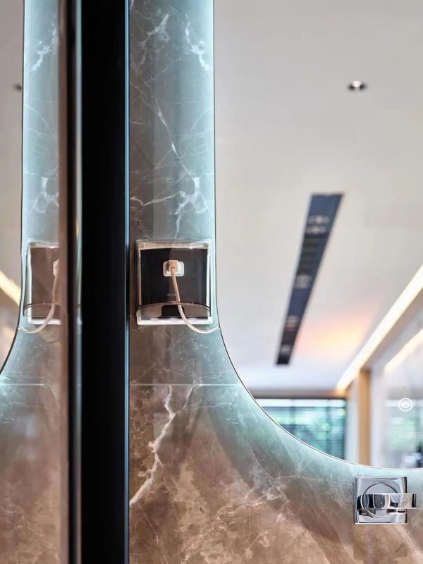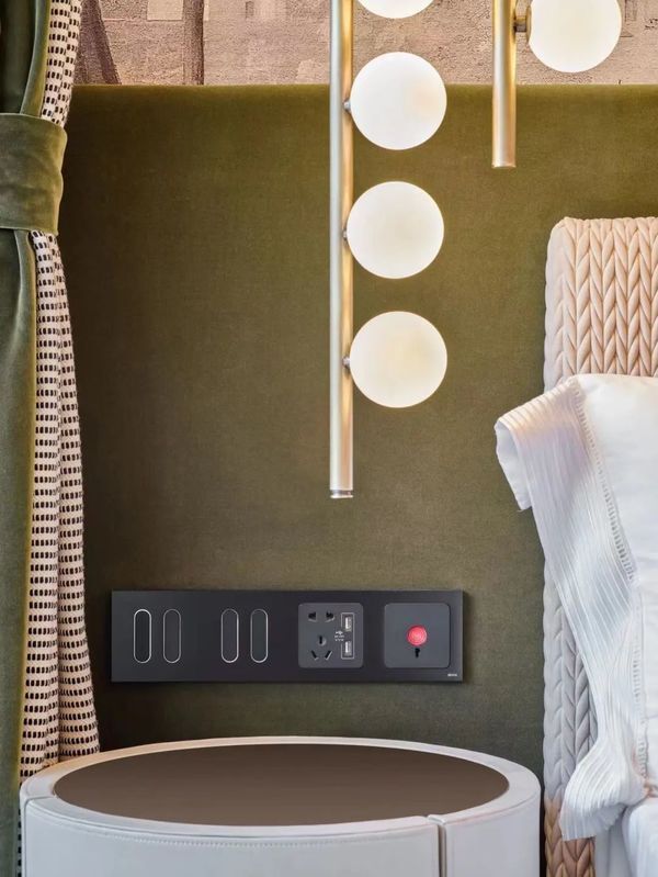 床头配备五孔带双USB插座,满足手机、IPAD等电子设备的用电需求;厨房操作台选用带开关的五孔插座,减少小家电插头的插拔次数,节约能耗;浴室插座搭配防溅盒使用,防尘防水,保障用电安全……