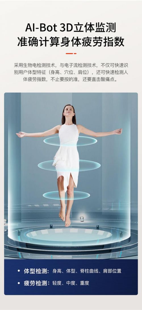 先检查再按摩,欧利华A8808Pro新升级AI-Bot 3D立体检测,采用生物电检测技术与电子流检测按摩者的体型 ,敏锐捕捉细小变化,锁定身高、肩部位置,自动贴合脊背曲线,贴合全家人体型。再通过人体痛感应激反应,智能捕捉酸痛点数据,运用大数据AI算法,智能匹配科学按摩程序,针对你个性化的定制按摩。