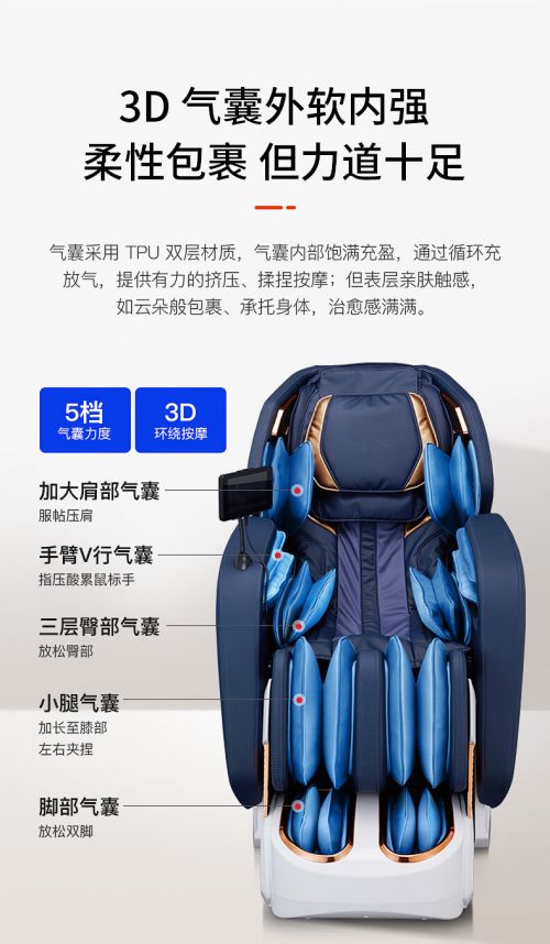 3D大气囊设计,均匀分布在肩部、手部、腿部、膝部和脚部,气囊弥补机械手按摩盲点。