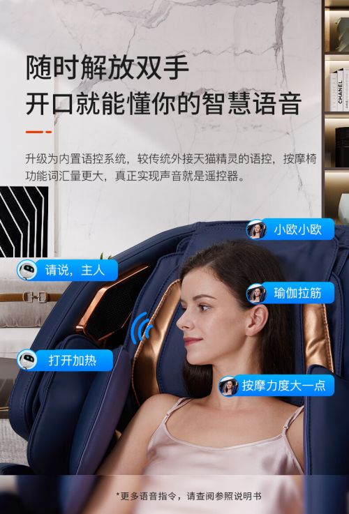 腰背、膝部、小腿恒温热敷;加热快,温度均匀,多部位同步呵护,按摩起来更尽兴。智能语音操作和可触控平板操控,功能清晰,简单上手。扶手配置无线充电模块,随放随充打消手机续航焦虑 安全感倍增!