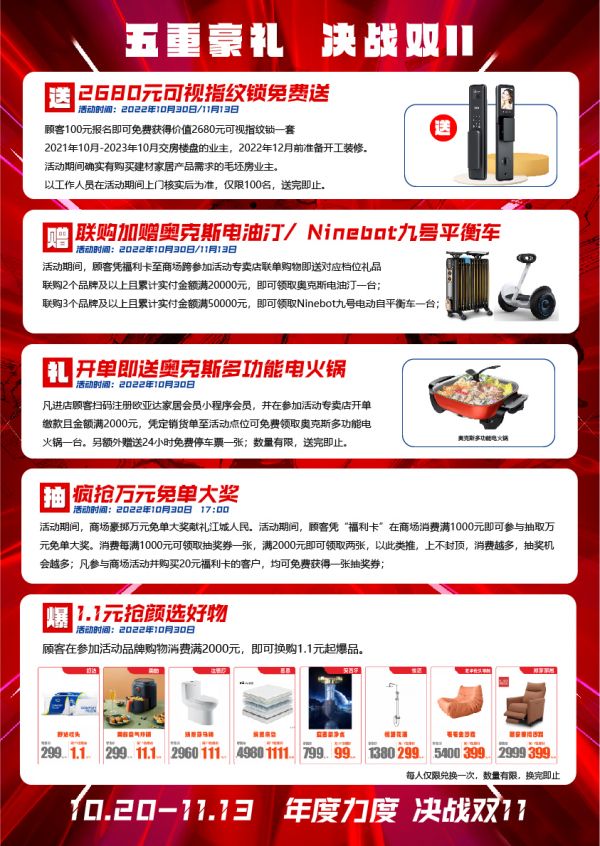 双十一用实惠的价格和高品质家居助力每一个消费者完成家居计划,展现出欧亚达光谷商场及各大品牌活力,并联合装修工长、知名设计师和新浪家居媒体资源,共同为消费者谋福利,一年一次,值得拥有!