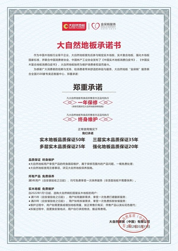 大自然地板实行“一年保修、终身维护”政策,正常使用情况下,承诺实木地板品质保证50年,三层实木品质保证35年,多层实木品质保证25年,强化地板品质保证20年,这一系列的承诺不仅是对自身产品的自信更是为切实保障用户的良好体验。