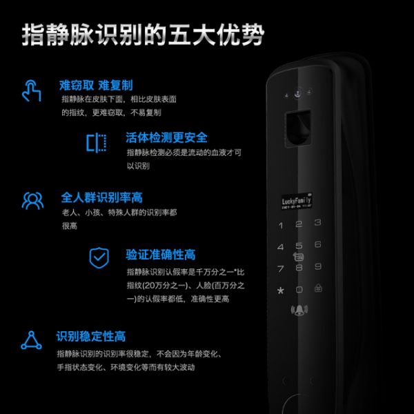 相比于常规的指纹kai锁智能锁,指静脉的好处在于: