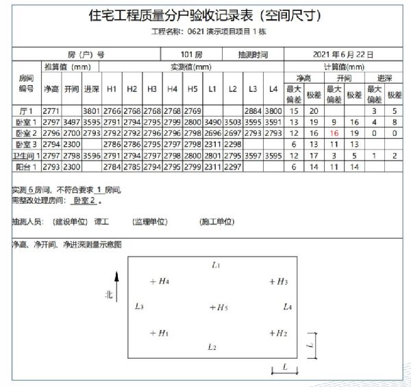 4.领慧实测机器人“分户验收”功能针对验收环节存在的痛点,自动检查多种质量指标,同时可以根据各省分户验收规程自动生成验收表格,可模拟人工取点规则(自动跨越门洞位置),同时自动确定北方向,确保数据成果满足规范要求。快速、精确、省时省力