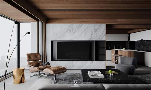 例如客厅的应用,精致的上苏云五合一功能木饰面,表面纹理清晰可见,彰显出自身的稳重和内秀,搭配白、灰、黑三种色调,在视觉上显得深邃沉稳,再加上落地式台灯,为客厅空间增添了一丝柔和。通过纯粹的色调与简约的家具,让空间在轻奢中融入极简,高级而有质感。