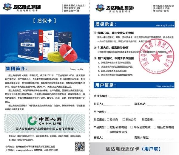 我们都知道,除了质量过关,售后更是赢得消费者口碑的关键。固达电集团不仅拥有5000+经销网点,可提供7*24小时专业售后支持,并且给客户提供线上线下双重质保服务。固达电线产品均由中国人寿保险承保,质保70年,线上线下均可申请。在质保卡上,固达公司承诺,如因电线质量问题引发火灾的最高可赔付60万元,正是因为这些实实在在的服务,才让每一个消费者买的放心,用的安心。