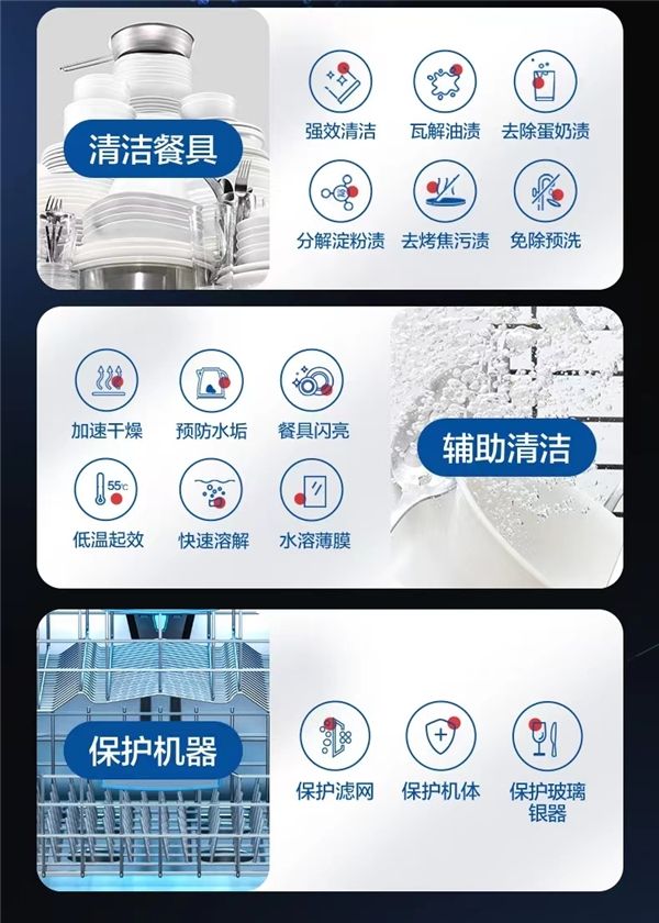 目前市面上也有不少多效合一的产品,每次只需投放一个,就可以满足日常洗涤需求。不过如果要想更进一步,达到洗护全能,其实更推荐大家囤货finish亮碟量子极净洗碗凝珠。这款洗碗凝珠在具备出色的清洁干燥能力的基础上,还进一步具备机体清洁功效,日常使用的话就不再需要额外清洁洗碗机了。