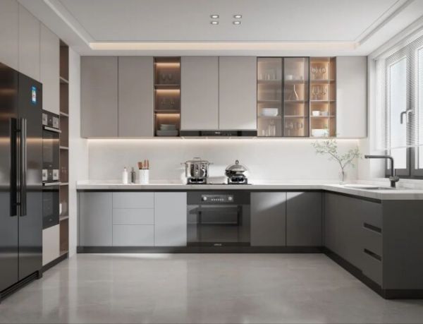 厨房小家电较多,如烤箱、微波炉等,定制橱柜时预留出空间嵌入电器,使厨房空间看上去更加整洁。