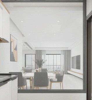 厨房与餐厅之间使用玻璃隔窗,隔而不断,打造半开式效果,视野更开阔,同时拉近与家人沟通的距离。
