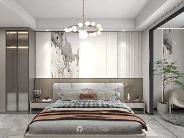 主卧沉静内敛,怡然自得。强调视觉上的层次变化,大量留白,大理石拼色背景墙稍作点缀,让空间更富轻盈感。