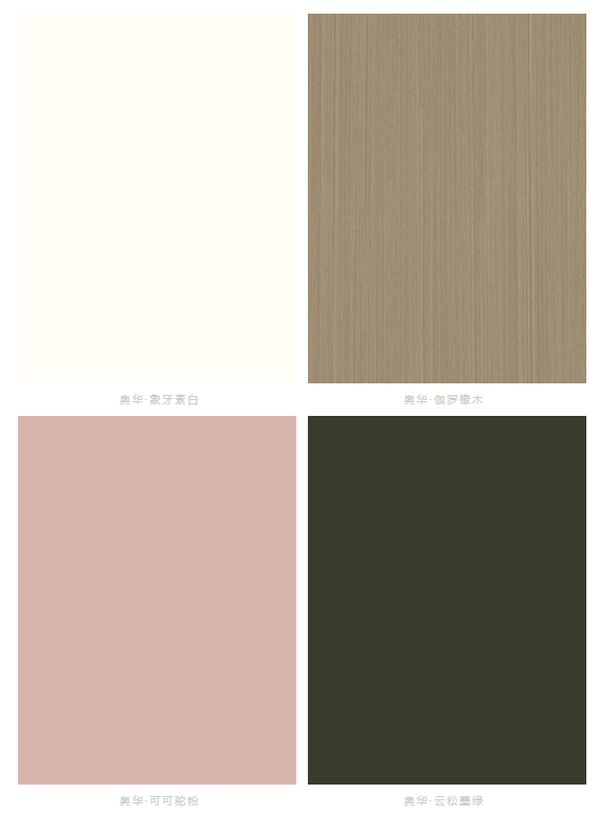 色彩,汲取柔美的感染力,让空间拥有了轻盈的律动。奥华象牙素白、伽罗橡木、可可驼粉、云松墨绿快速凝聚天真情感与浪漫情态,予一方私属小天地。