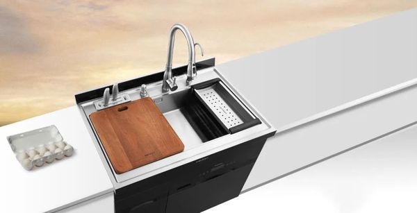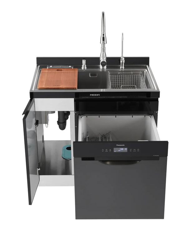 备菜区的收纳,相较就简单多了,因为只有砧板和刀具两类厨具。但对于很多小厨房来说,墙面与台面的收纳空间极为有限,不如将刀具砧板收纳在水槽区域也是一个不错的选择。美大集成水槽洗碗机的集成属性便能完美实现,它自带嵌入式刀具收纳空间,有效利用了细节空间,而且砧板可放置于水槽之上,备菜洗菜切菜集成一体,日常不用时砧板也不用另收他处,方便高效又不失整洁。