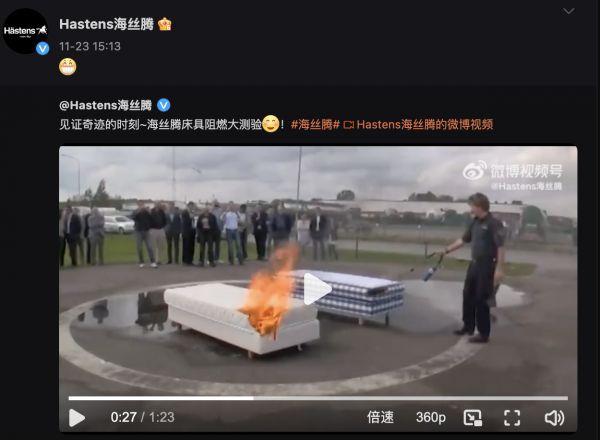 很快,就有网友爆料称该床垫来自瑞典手工寝具品牌“海丝腾”,并且是订价接近200万的高奢定制品。11月23日,在该床垫“被销毁”的当天,海丝腾官方微博也相应转发了自身品牌床垫的阻燃测验,暗示该床垫“阻燃”,无法直接被烧毁,急速营销了一波,而最终这个不知真假的床垫被工作人员用刀划开,最后由回收车拉走。