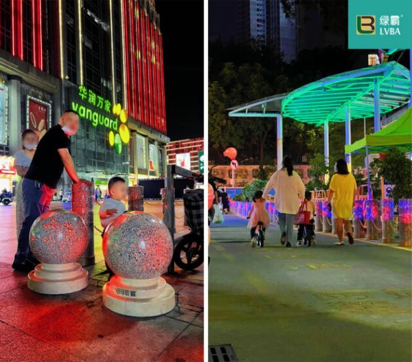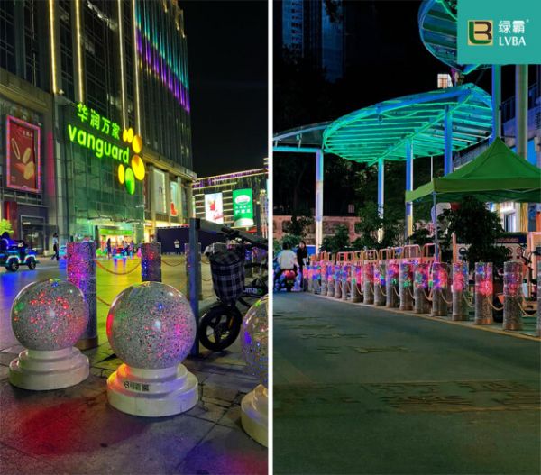 绿霸发光球应景而生,日间是阻车球,夜间通电后球体表面发光, 色彩变幻丰富,为应用场景提供亮化、警示、防护的作用。正好为华润万家外广场道路光线问题提供了最优选择,独有的发光效果给道路提供全新的感官体验,星光熠熠的发光阻车球也满足了群众的好奇心,让整个广场道路更具时代感,同时也保障了行人车辆的夜间出行安全,重新定义了一块圆滚滚石头的使命。每当在超市满载而归,充斥着人情味的超市里,让饱受疫情反复困扰的顾客,在万家超市热气腾腾的烟火气中得到慰藉与治愈。华润万家是新的生活方式,致力于改善消费者生活品质,以持续的优化和创新发展,营造多元化、全方位的丰富消费体验,提供高质、超值、安全的商品和服务,为消费者带来家的温馨、富足、健康,带来越来越好的生活方式,这也是绿霸选择和万家合作的重要谋合点,同样选择将客户服务放在重要位置上。